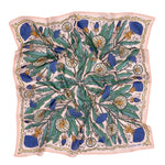 Color: Pale peachy-pink background with blue, green, and gold