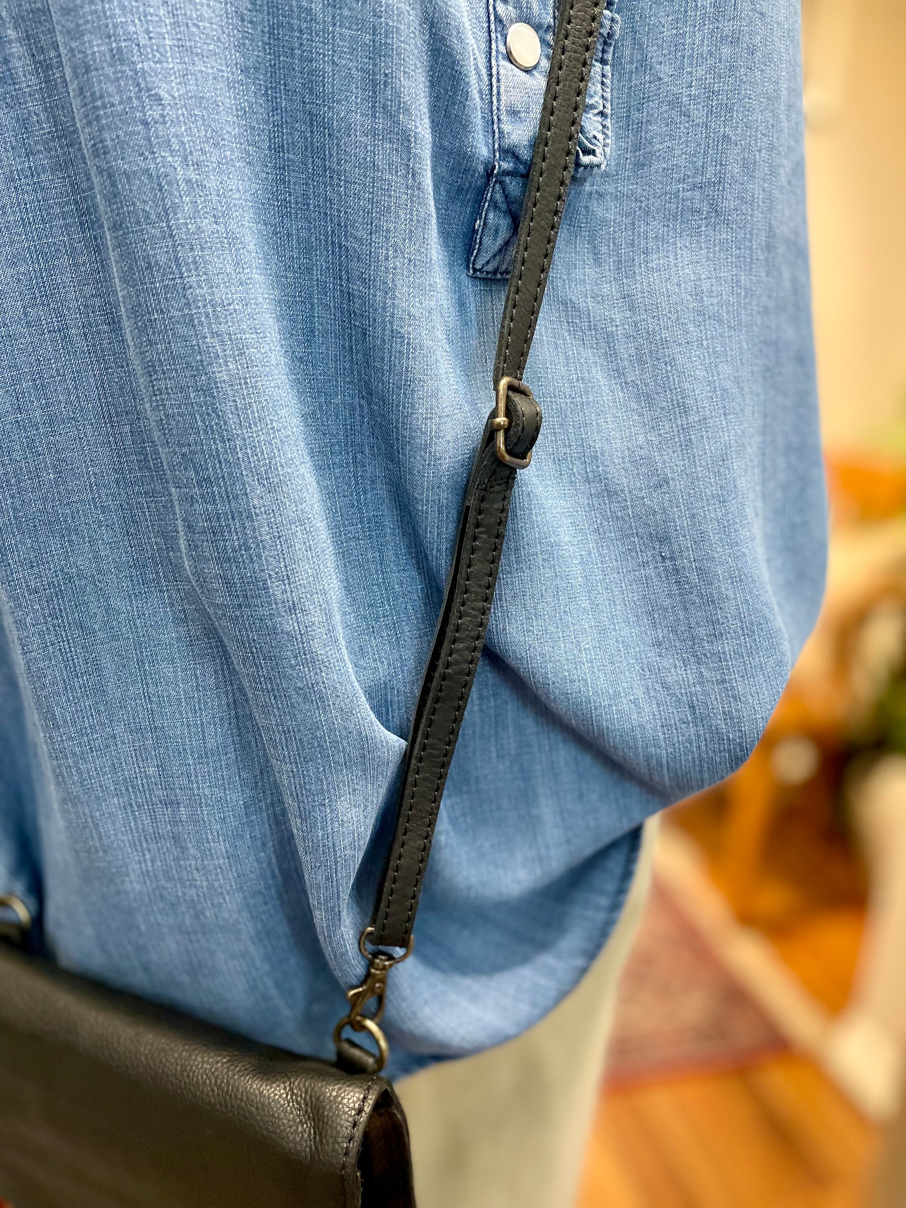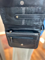 This slim crossbody bag is the perfect bag for anyone on the go! Magnetic top closure, four open pockets, two zippered pockets and seven card slots with snap closure.