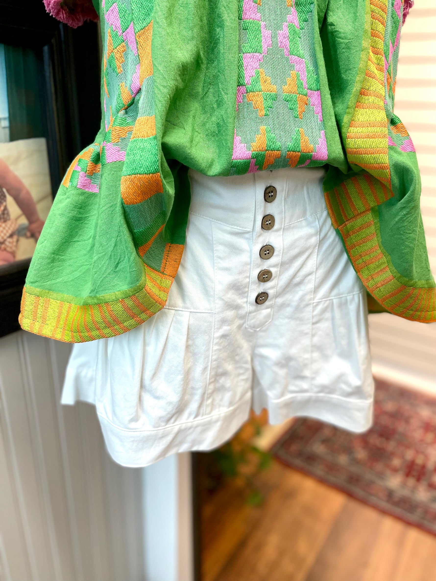 Solid shorts featuring an exposed button fly, tiered seaming, two side pockets, a back elasticized waistband and is a relaxed fit body.