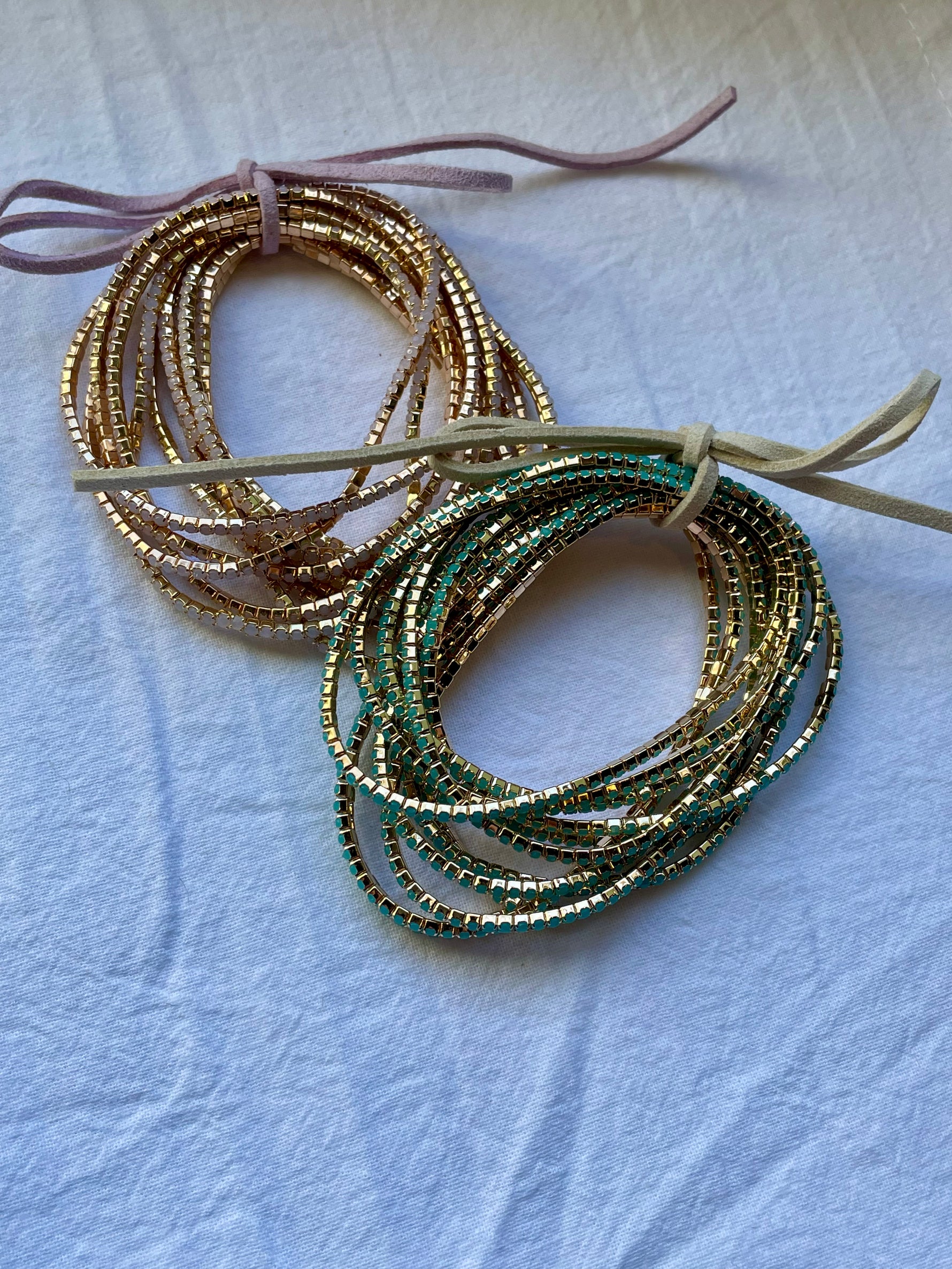 12 bracelets collected with a leather bow. You can leave on or take off and wear them separate.