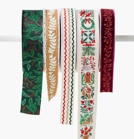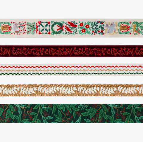The prettiest presents, tied with a bow. Our ribbon set is designed to pair with our illustrated wrap or your favorite solid colors. The boxed set of five illustrated ribbons includes one spool of velvet, one spool of jacquard, one spool of grosgrain, and two spools of satin.