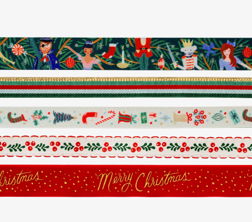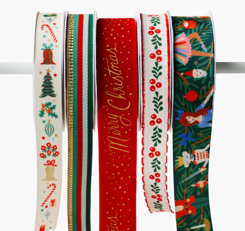 The prettiest presents, tied with a bow. Our new ribbon set is designed to pair with our illustrated wrap or your favorite solid colors. The boxed set of five illustrated ribbons includes two spools of grosgrain, two spools of satin, and one spool of velvet ribbon with metallic gold accents.