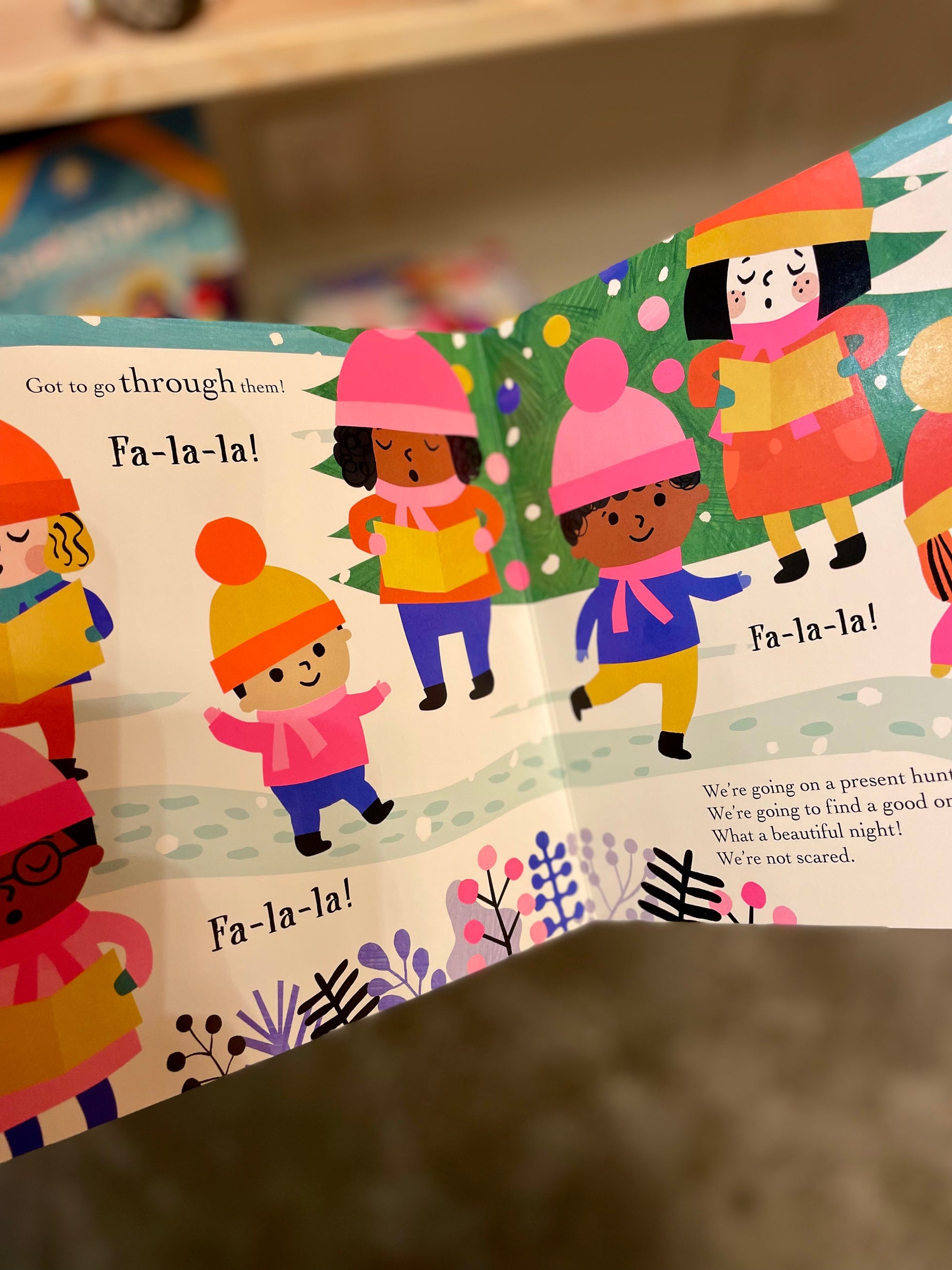 Now available as a board book! A fun and festive reimagining of the classic American folk song, “We’re Going on a Bear Hunt,” made famous by Michael Rosen and Helen Oxenbury.Three children are off on a hunt for the perfect Christmas present! But first they’ve got to get through the spiky Christmas trees, a herd of hungry reindeer, some noisy carol singers, and a very busy toy store! But there are SO MANY toys . . . will they ever find the perfect present? This joyful stocking stuffer has zingy neon ink on the cover and throughout, and is filled with cute characters and Christmas surprises! Repeated phrases and sound words make this an interactive picture book, great for sharing with the whole family at Christmas.