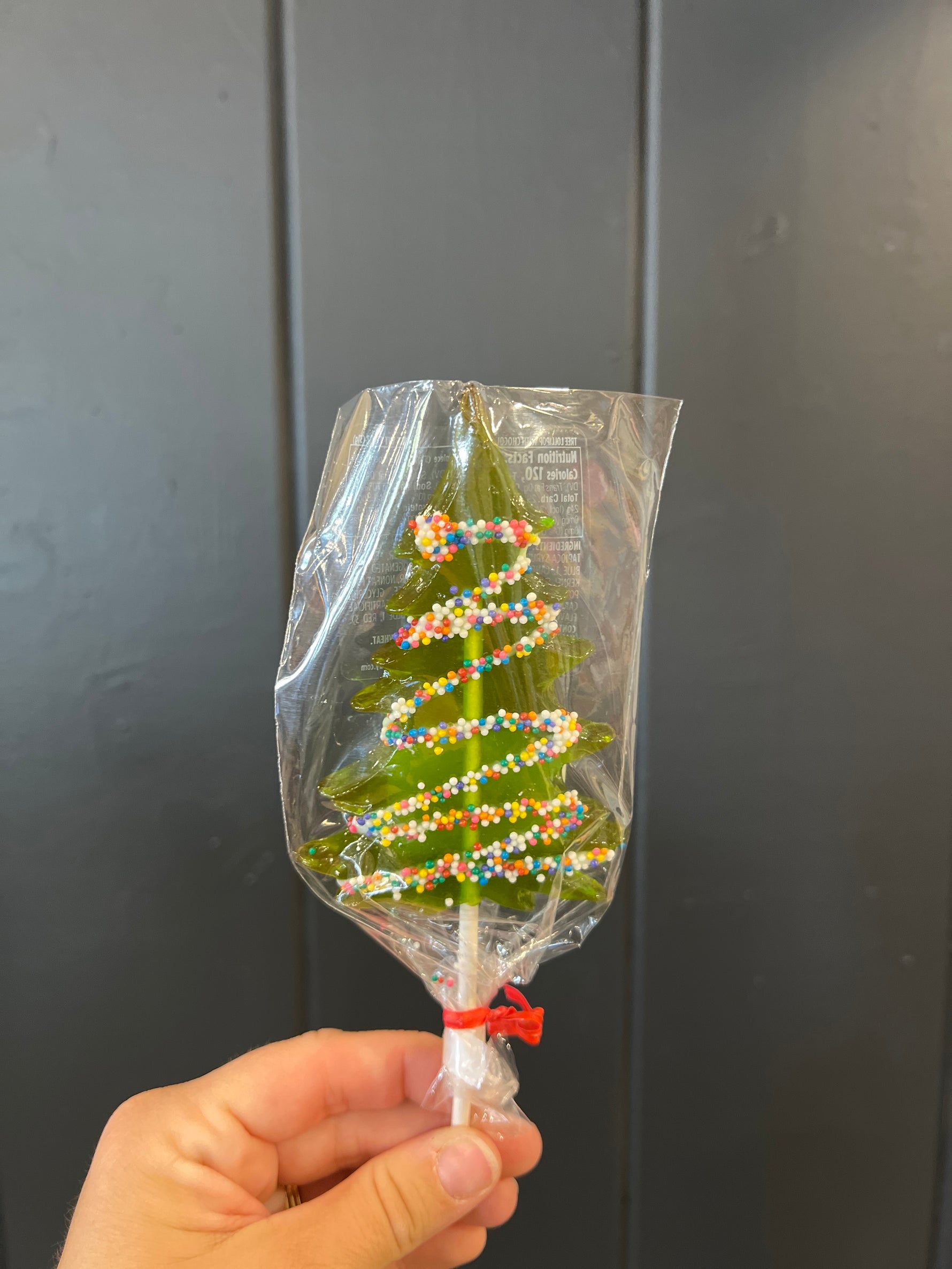 Our Icon Nonpareil Drizzle Tree Lollipops come in lime green (apple) and is embedded with candy nonpareils with a chocolatey drizzle. Each lollipop is hand-poured to order; slight variations will occur.