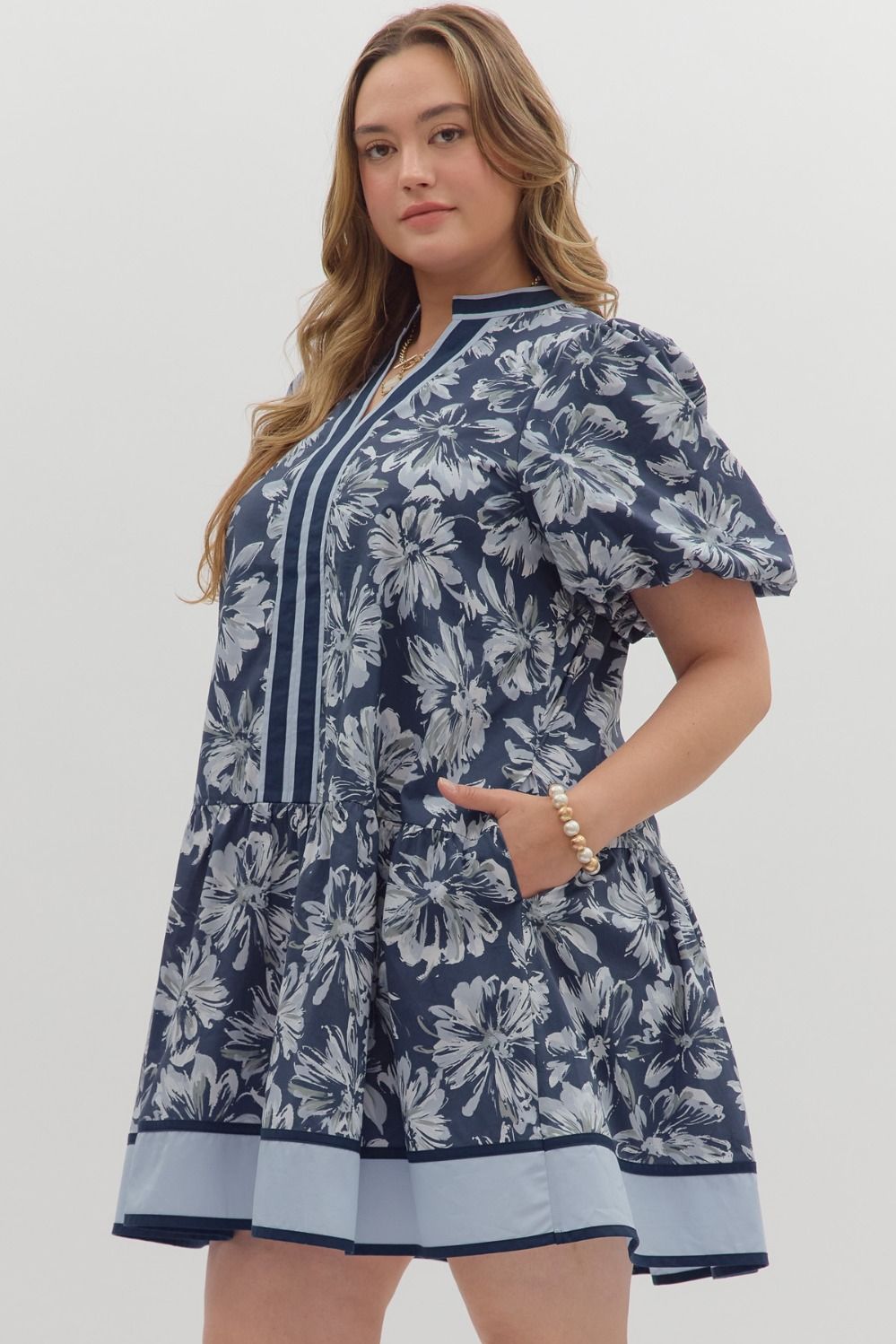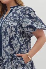 Floral print short bubble sleeve ruffle hem mini dress featuring multicolor contrast accent neck band and hem finish. Side Pockets. Lined. Woven. Non-sheer. Lightweight.