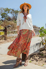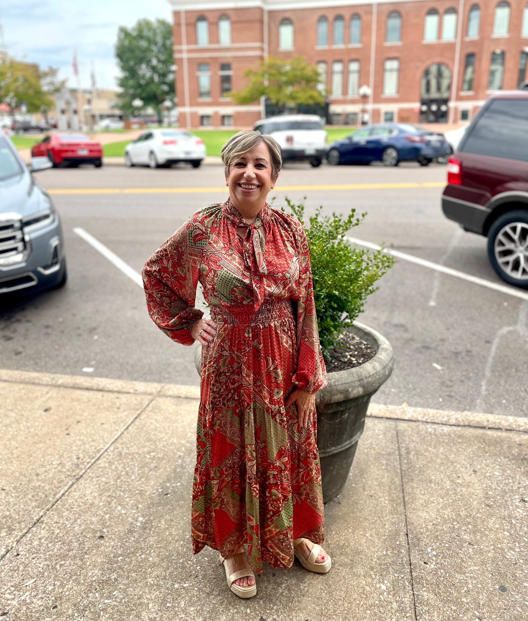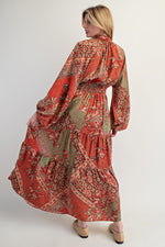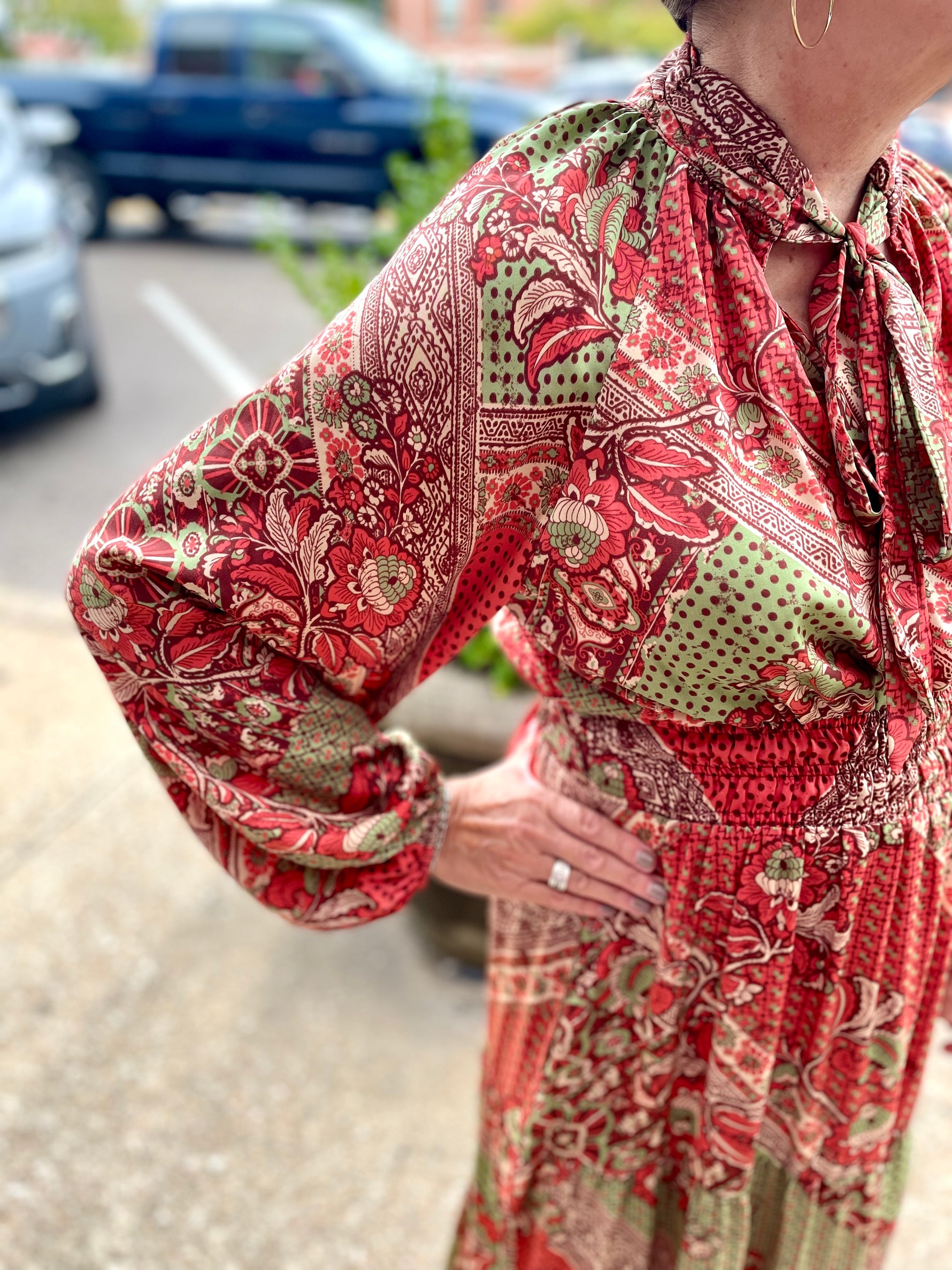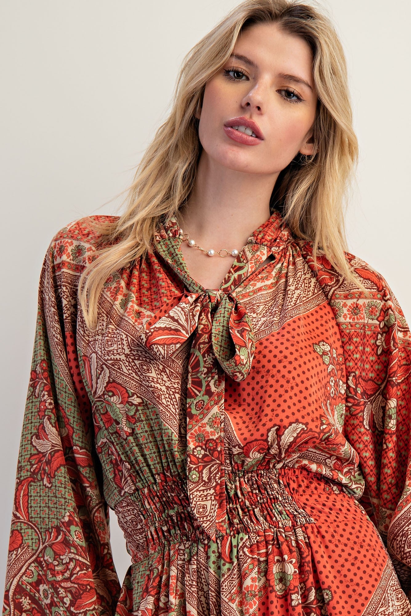 PRINTED MIRABELLE SATIN MAXI DRESS -BOHEMIAN-STYLE MAXI DRESS -MIXED PATCHWORK PRINT -HIGH NECK WITH A TIE BOW -LOOSE, FLOWY FIT
