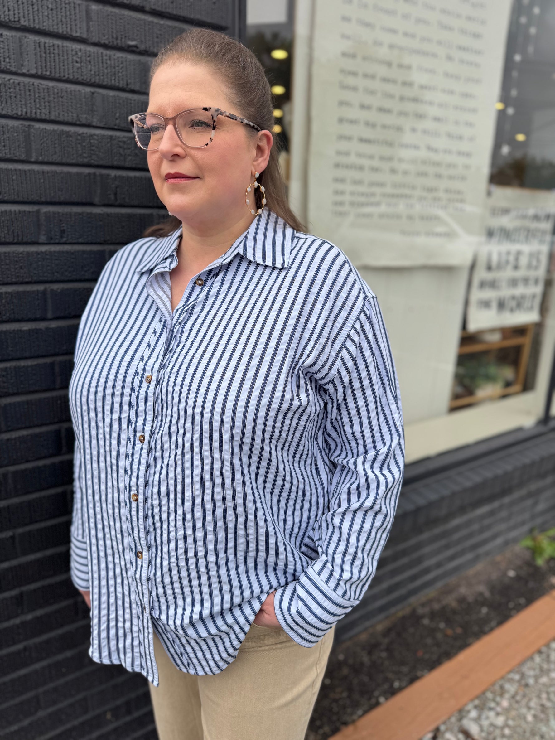 Textured striped pattern long sleeve button down collar shirt featuring pleated drape hem detail at back. Unlined. Woven. Non-sheer. Lightweight.
