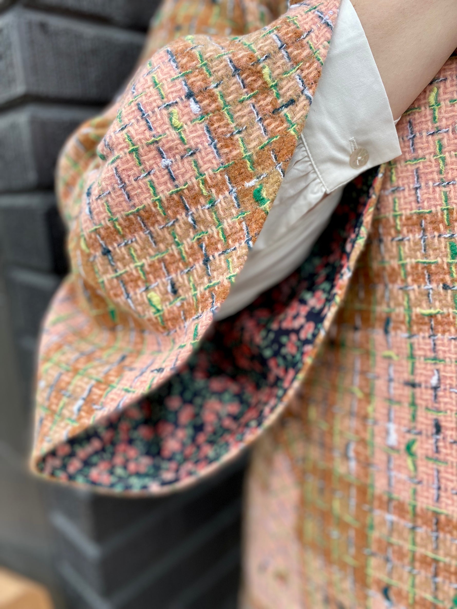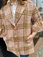 Plaid Coat with front buttons and a statement ruffle on the sleeve, hitting above the wrist.