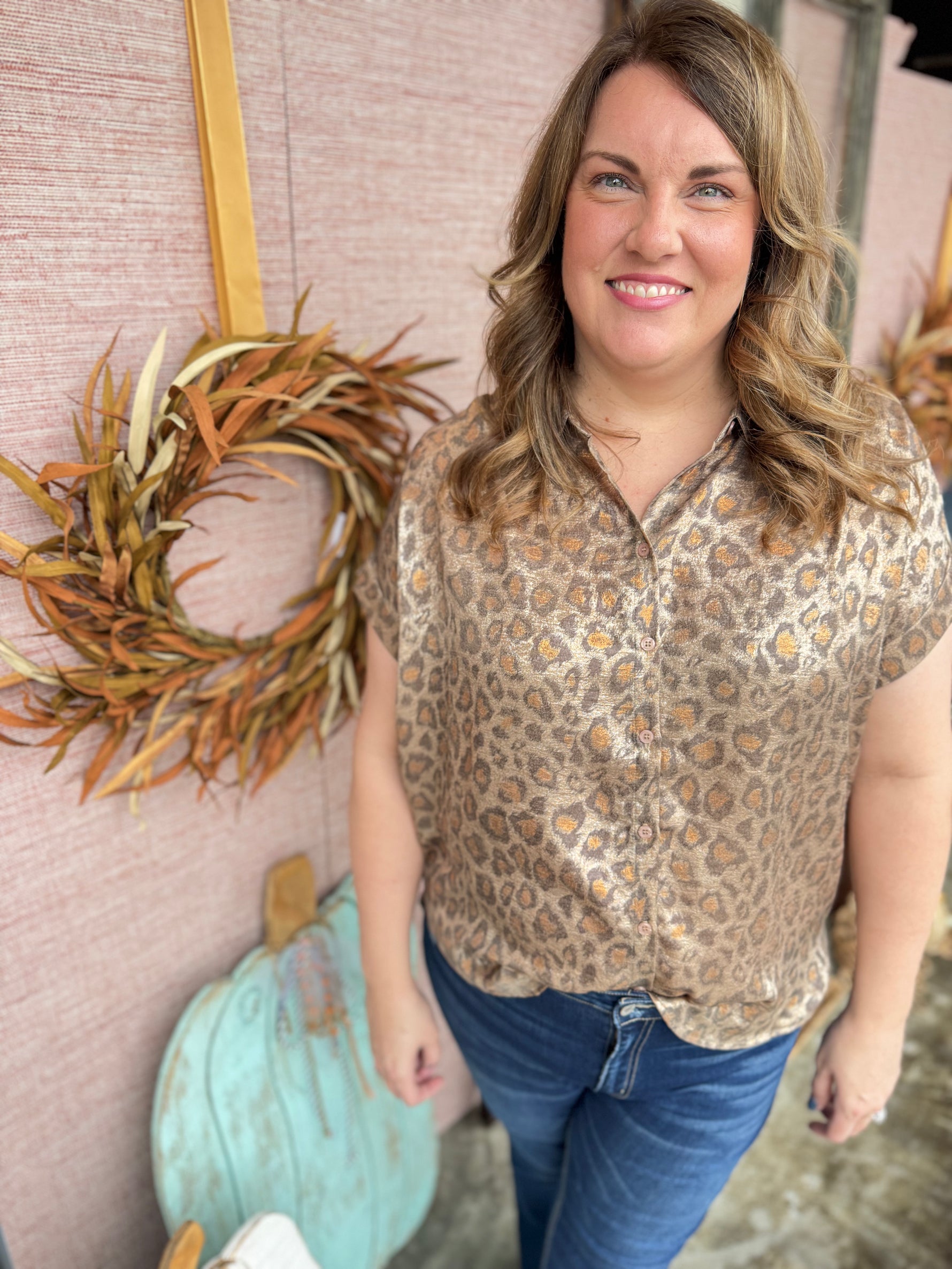 Collared button up top with cuffed short sleeves and ruched shoulders.