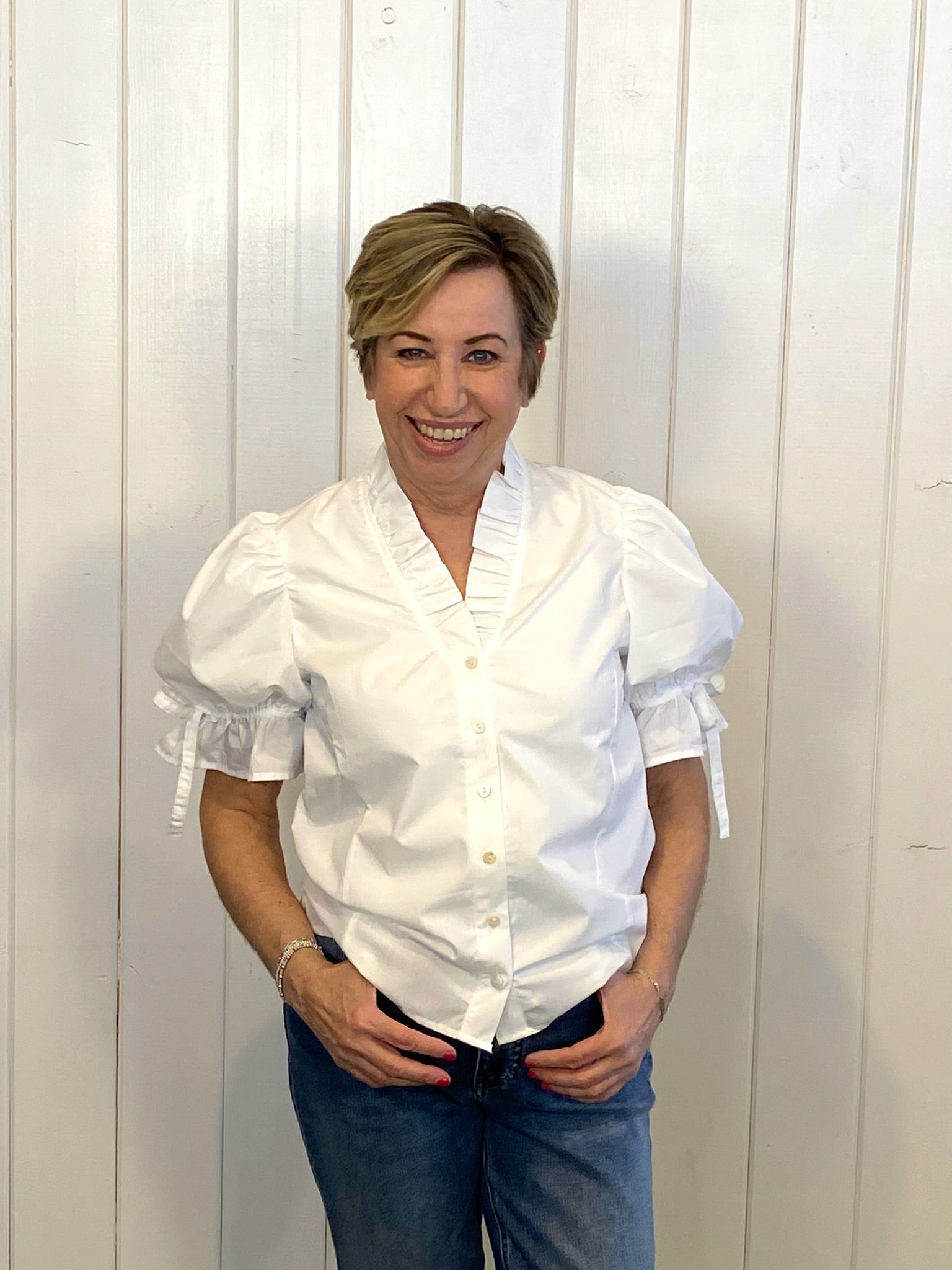 Solid elasticated short puff sleeve top featuring ruffle finish v-neck front button closure. Lined. Woven. Non-sheer. Lightweight.