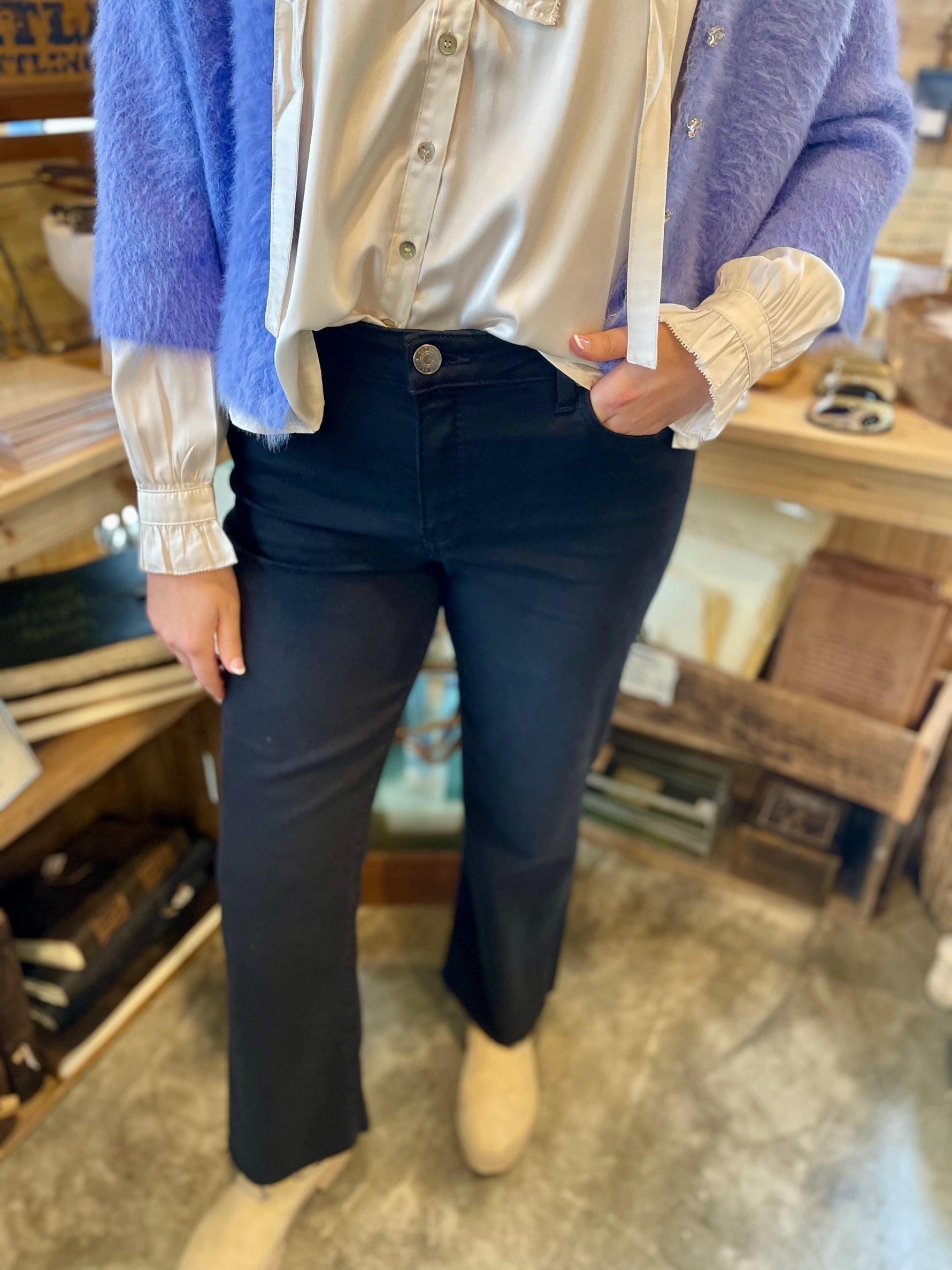 These timeless wide-leg jeans offer a relaxed and casual fit that gently contours to all body types. Perfect for effortless style, they seamlessly transition from day to night. The wide hem and statement pockets allow for these jeans to be casual for date night, or dressed up with business casual.