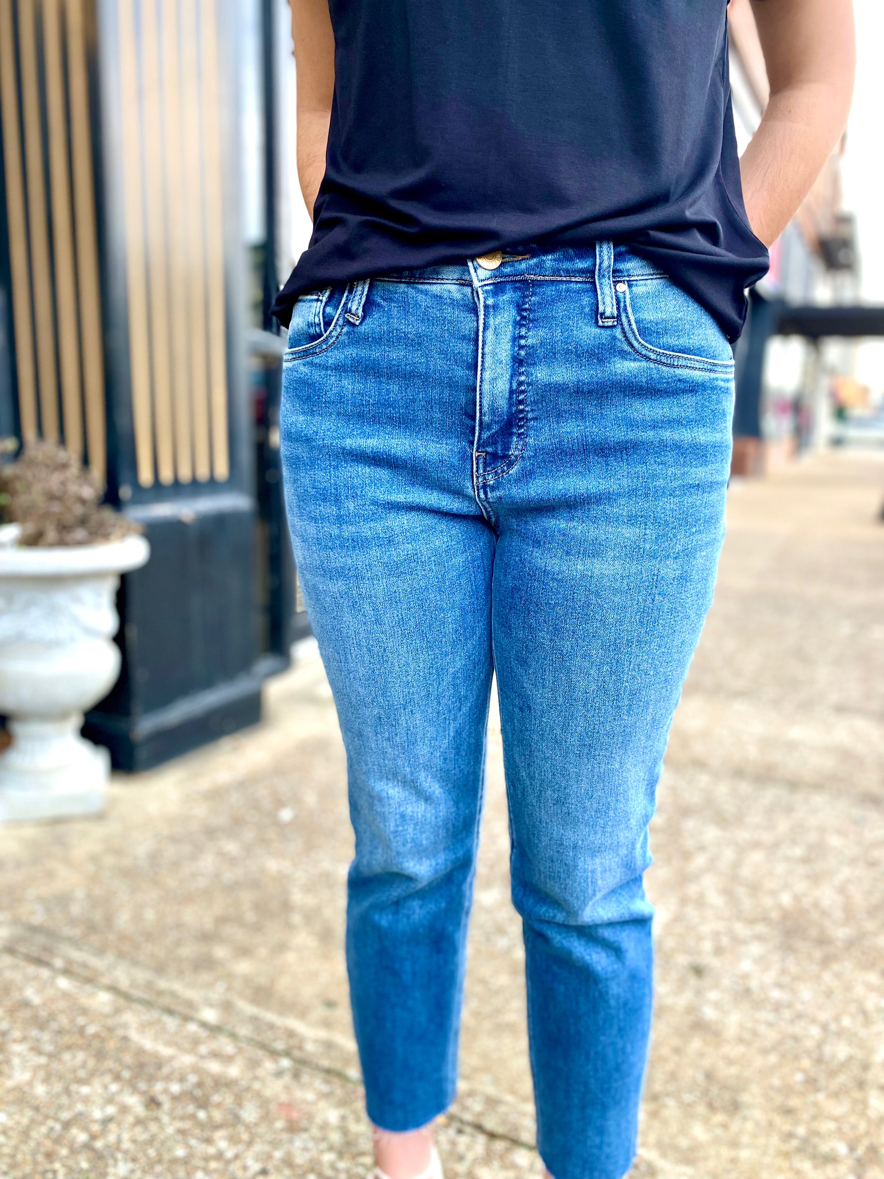 - Artfully faded for a vintage vibe, these stretchy, slim-cut jeans flatter with a dark wash with a raw hem and Fab Ab front pockets that comfortably shape and smooth.