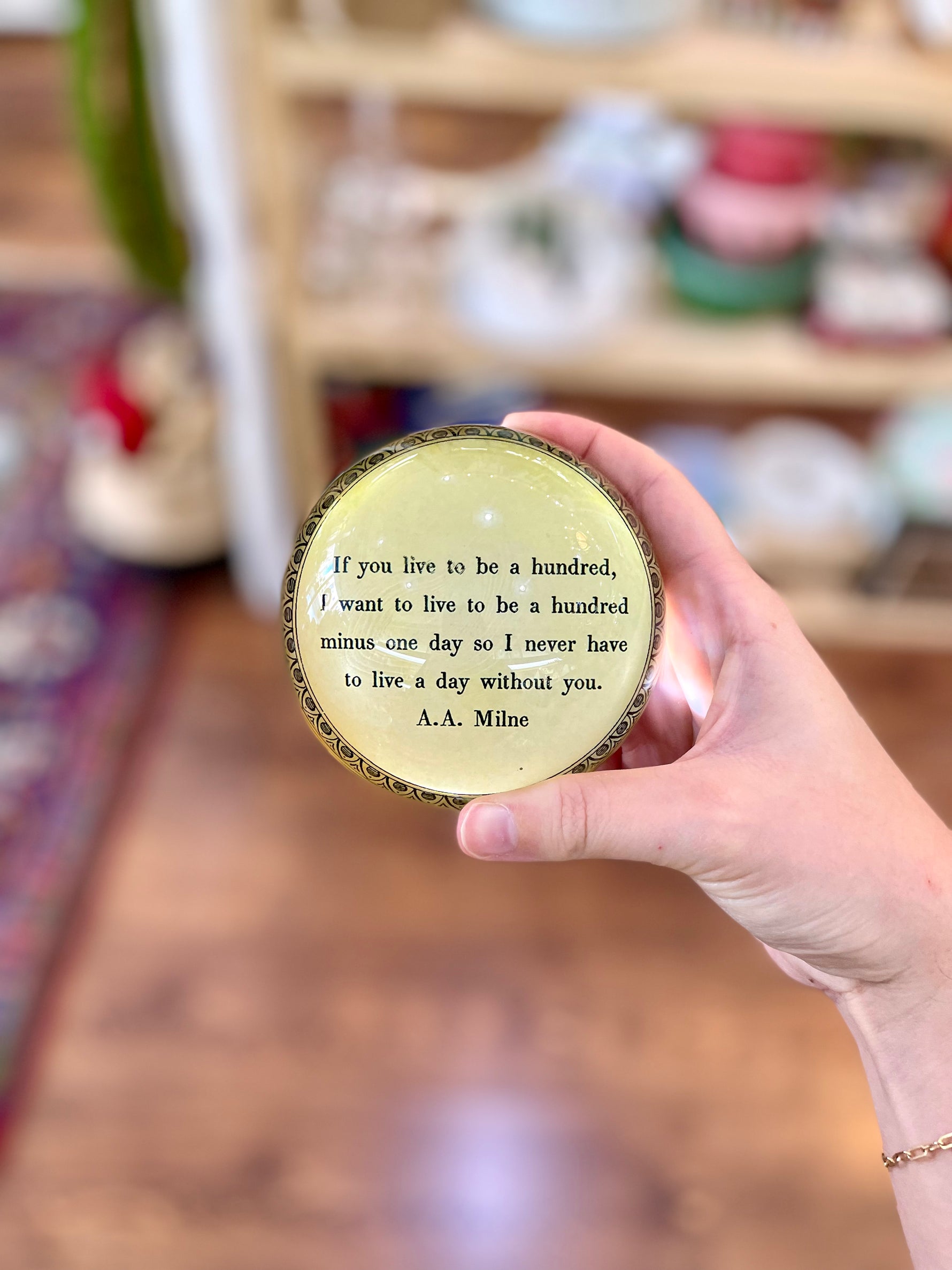 This classic paperweight features a decorative border and an A. A. Milne quote: "If you live to be a hundred, I want to live to be a hundred minus one day so I never have to live a day without you."
