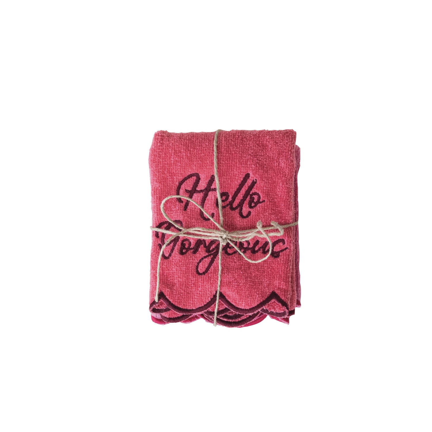 10" Square Cotton Terry Wash Cloths with Embroidered Saying + Scalloped Trim "Hello Gorgeous & Hello Beautiful"