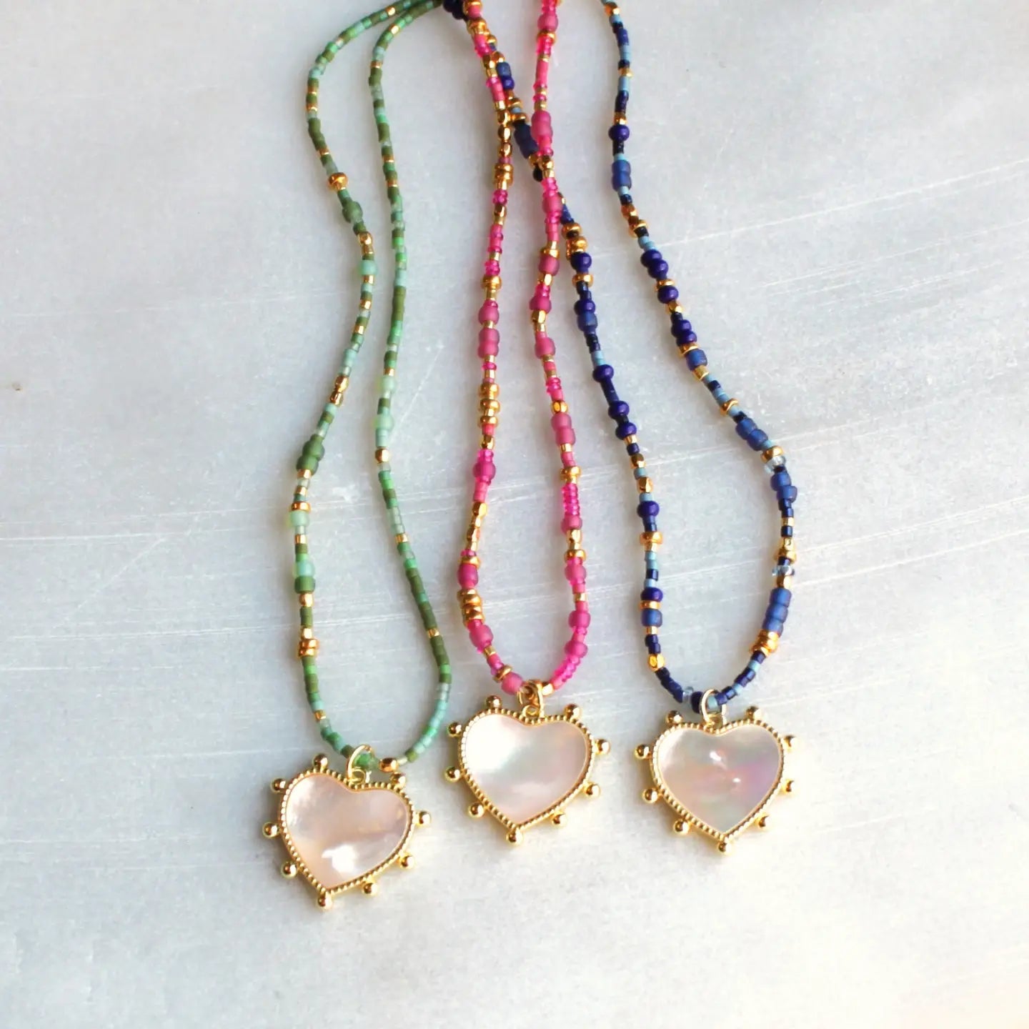 Elevate your jewelry collection with these exquisite handmade beaded necklaces, each adorned with a stunning heart-shaped mother-of-pearl pendant set in a luxurious gold-toned frame. Each necklace is designed to add a touch of elegance and charm to any outfit, making them perfect for both everyday wear and special occasions. Whether you're treating yourself or looking for the perfect gift, these necklaces are sure to impress!