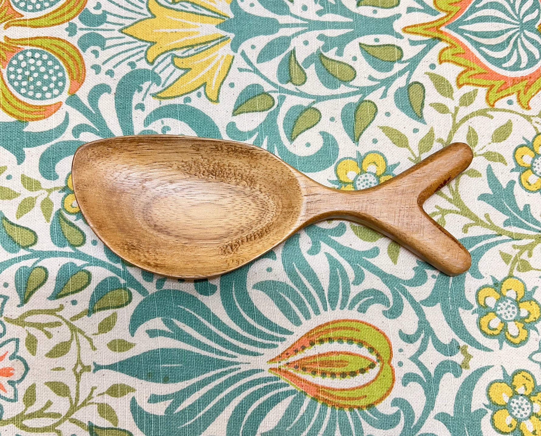 Natural wood fish shaped scoop perfect to add to a seasonal table scape. Perfect for dipping out salads or nuts from your favorite bowl.