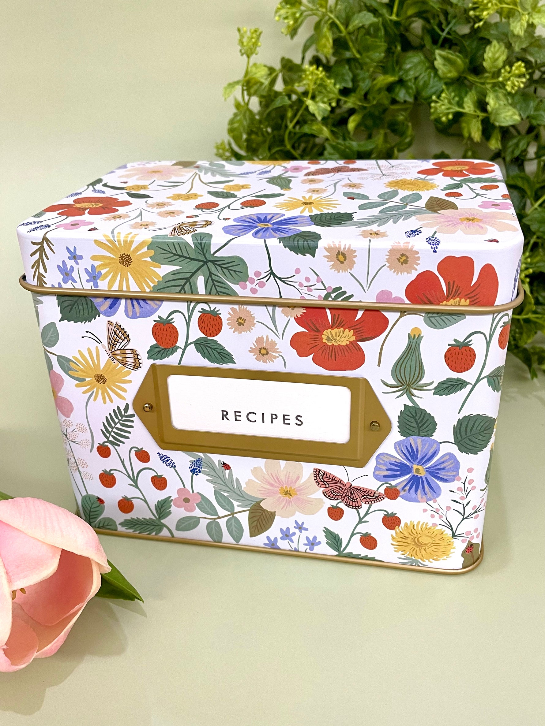 Bring a little cheer and charm to your kitchen with our floral Recipe Tins. Each box features a gold metallic interior, a gold-framed label on the front, and includes 24 recipe cards and 12 recipe dividers.
