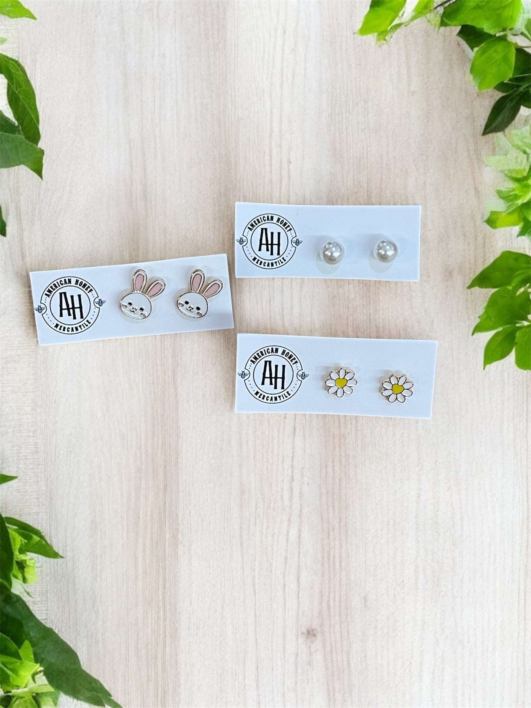 Celebrate spring with these stud earrings. Bunnies, pearls and flowers leave us ready for all that spring brings.