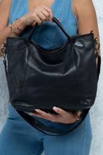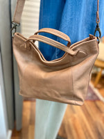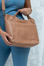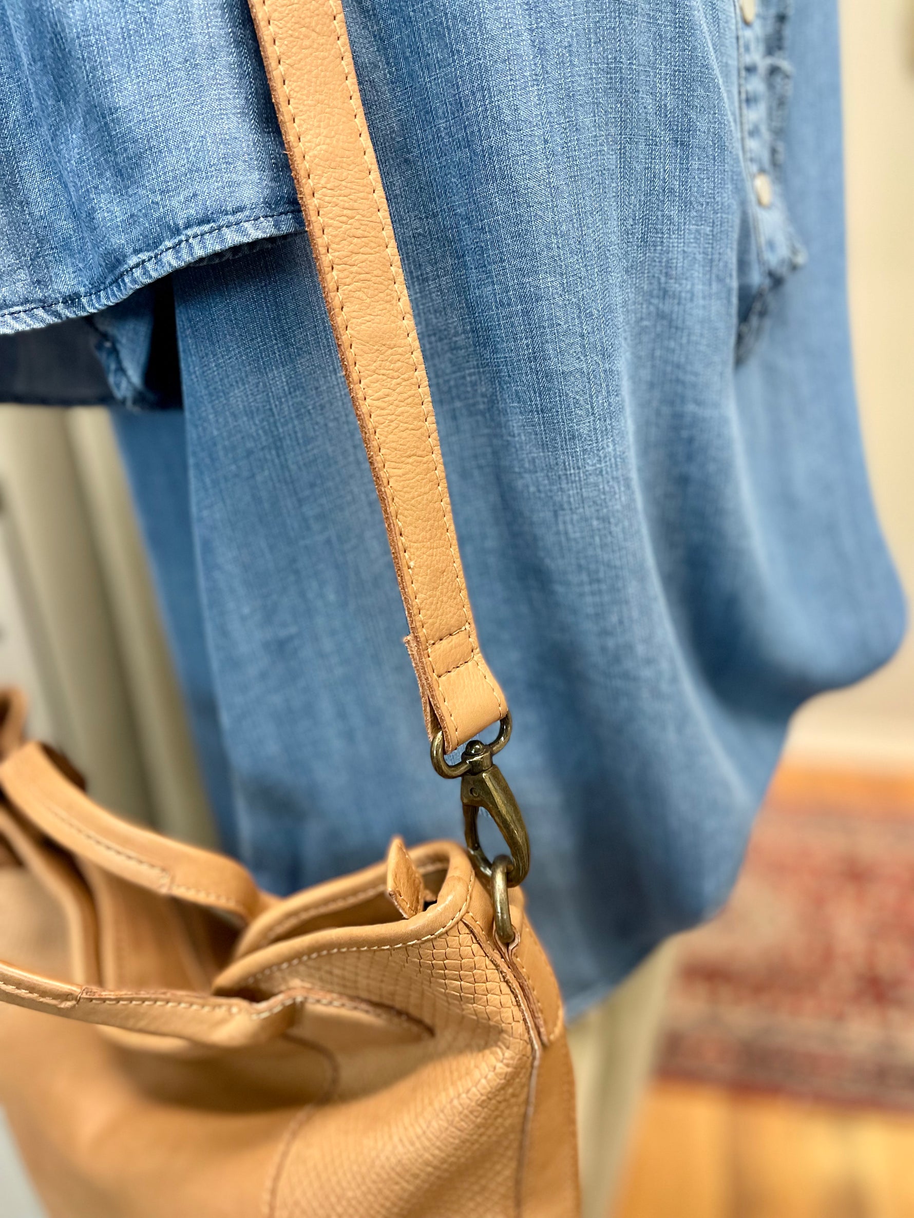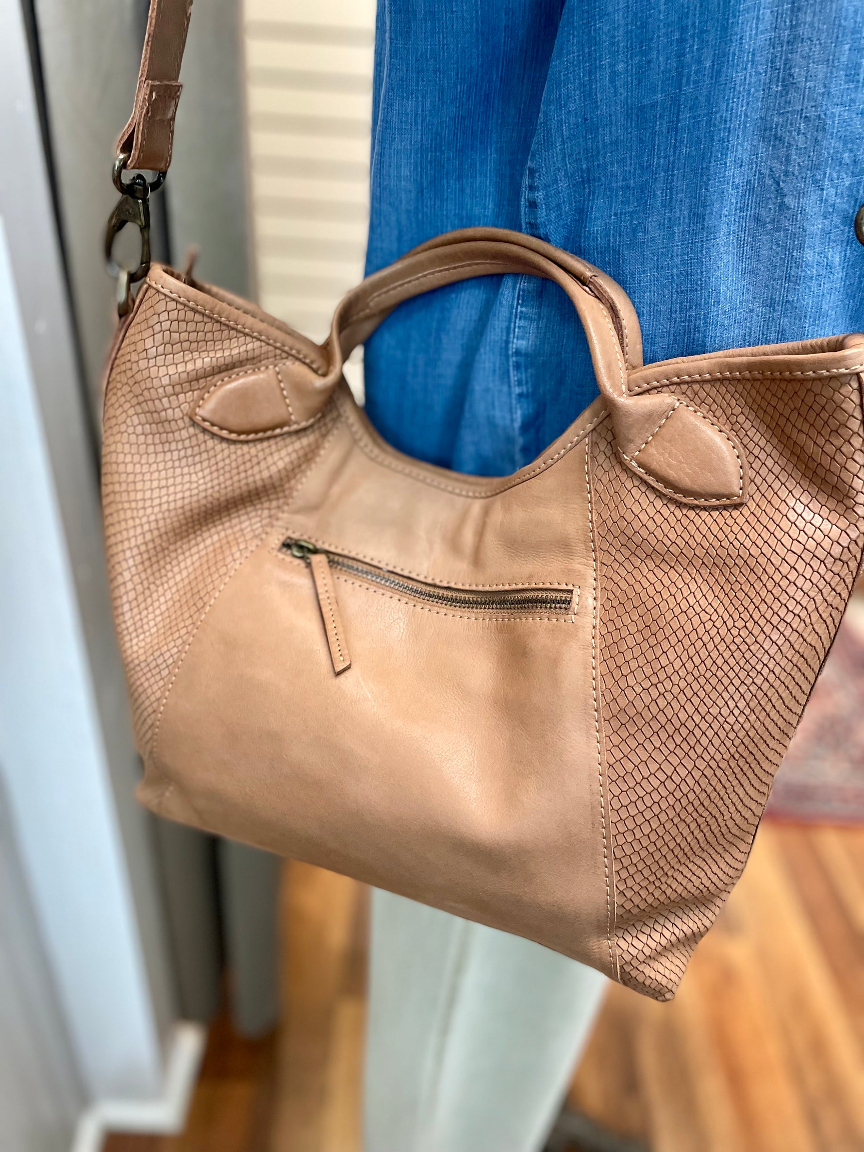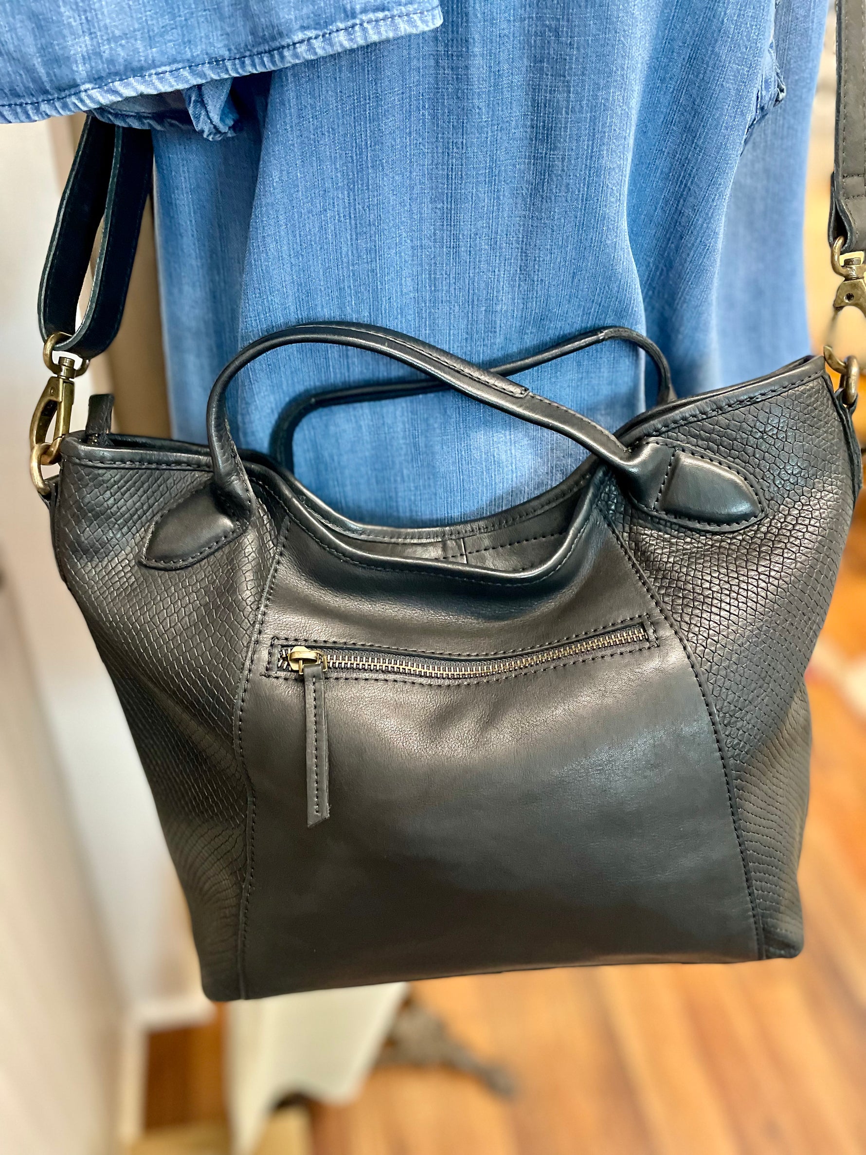 This satchel style bag features a mixed media exterior finish; soft, smooth leather with a subtle python design on the sides. A large exterior zippered pocket, three interior side pockets as well as a detachable should strap.