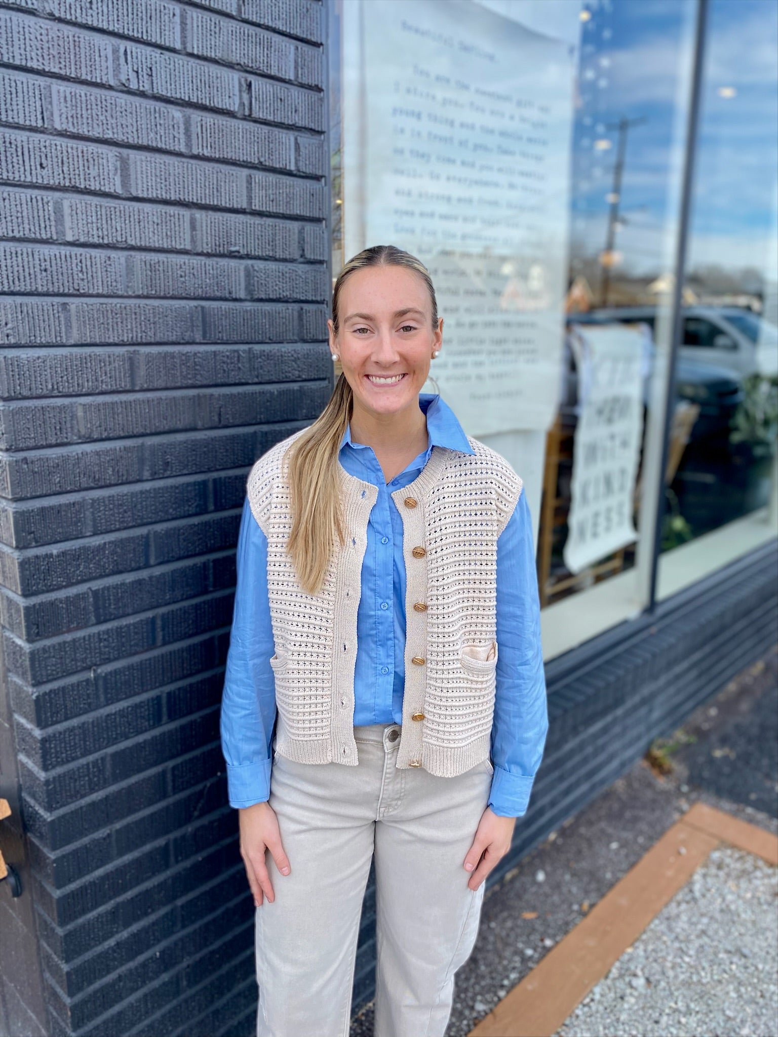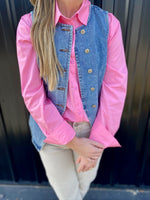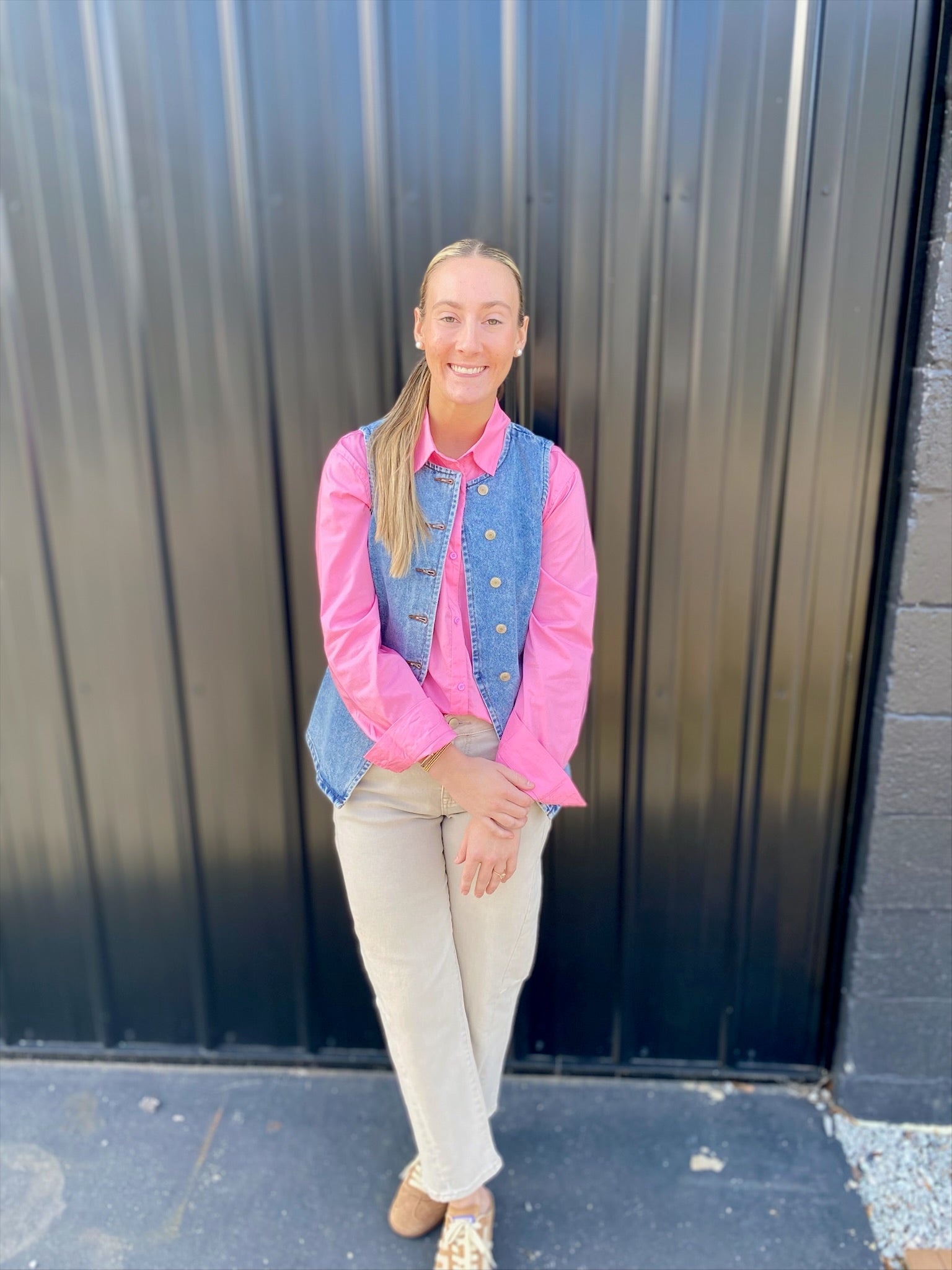 Classic and versatile button-down top featured in a boxy & oversized silhouette with classic collar detail and a front pouch pocket. Fabric is a lightweight and breathable texture.