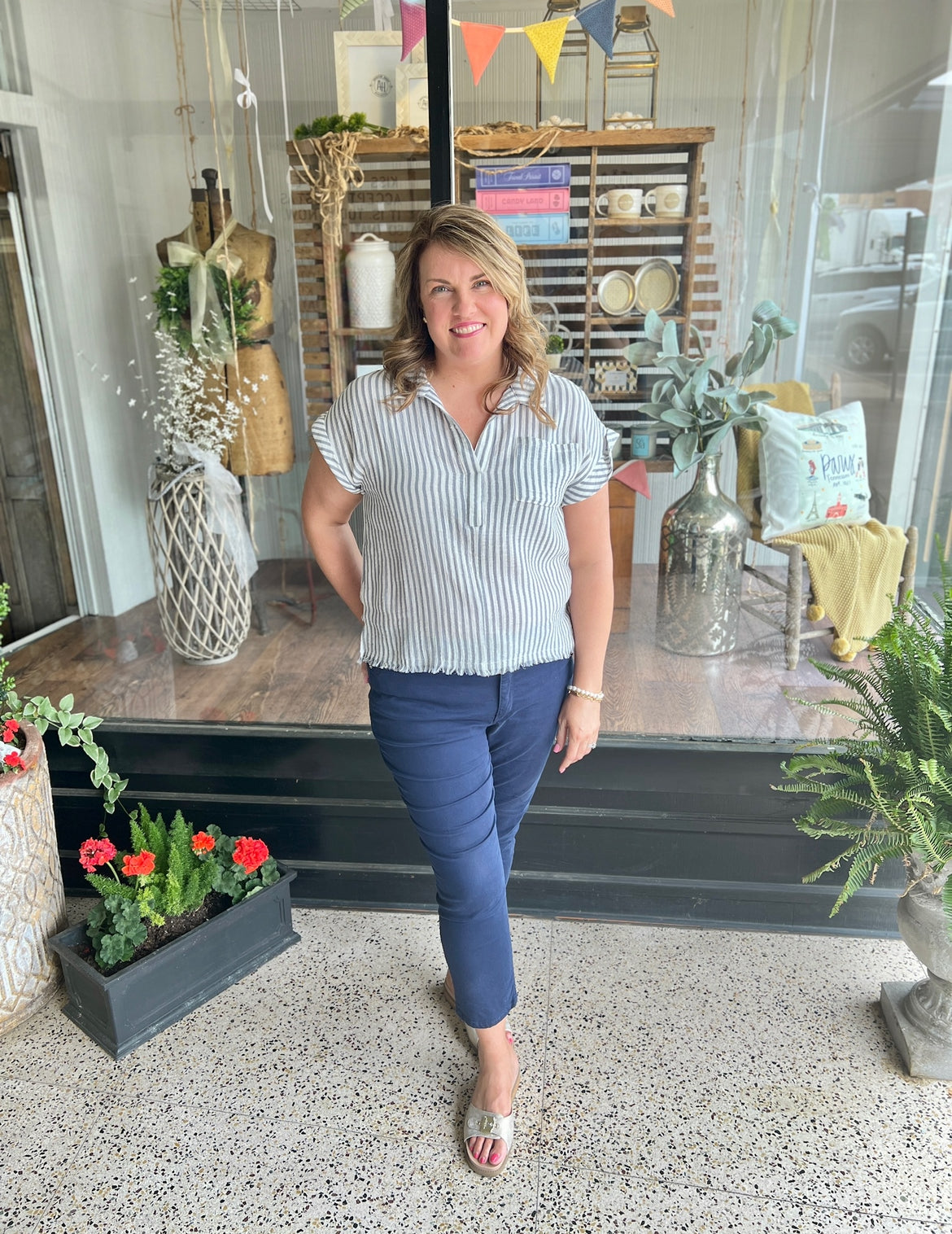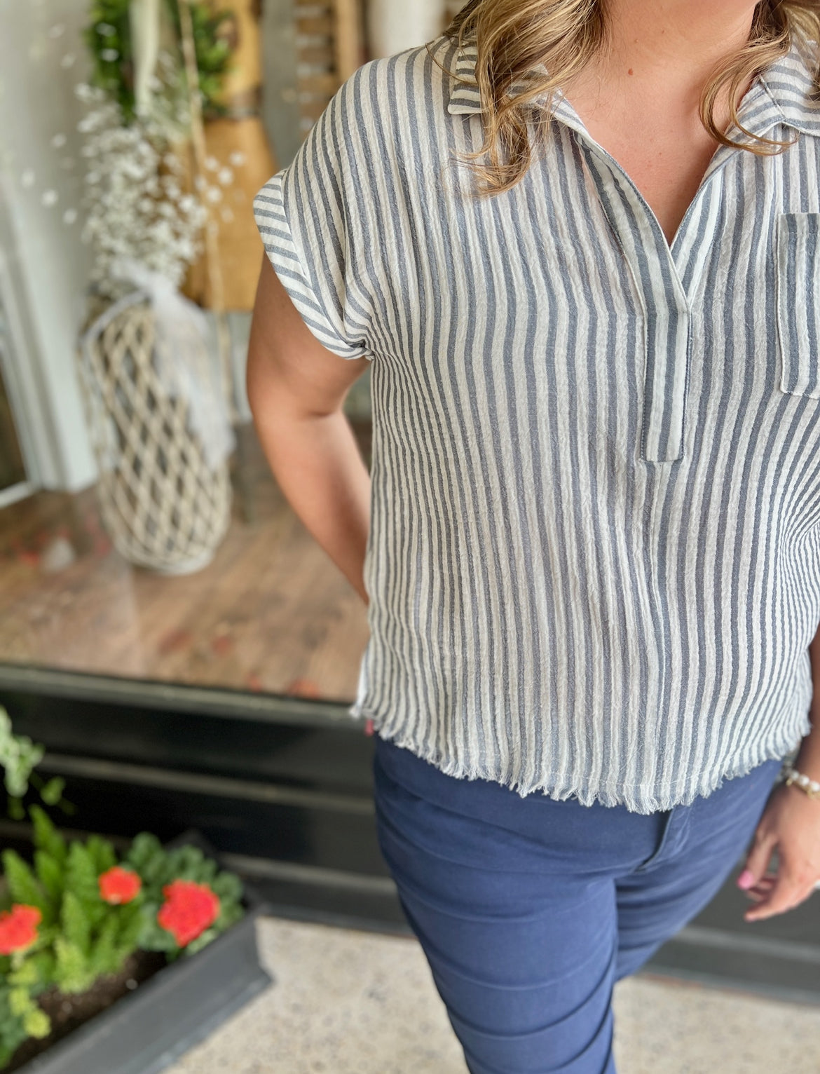 Striped short sleeve blouse top featuring a collared V-neckline, one open front chest pocket, two side slits, is a high-low design with a frayed bottom hem and is a loose fit body.