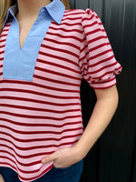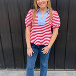 Short sleeves stripe top with solid contrast neckline, collared, v neck, textured rib fabric.