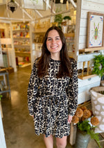 Long sleeves floral dress with side pockets, ruffled neckline, front button, lace trim detail, waist tie.