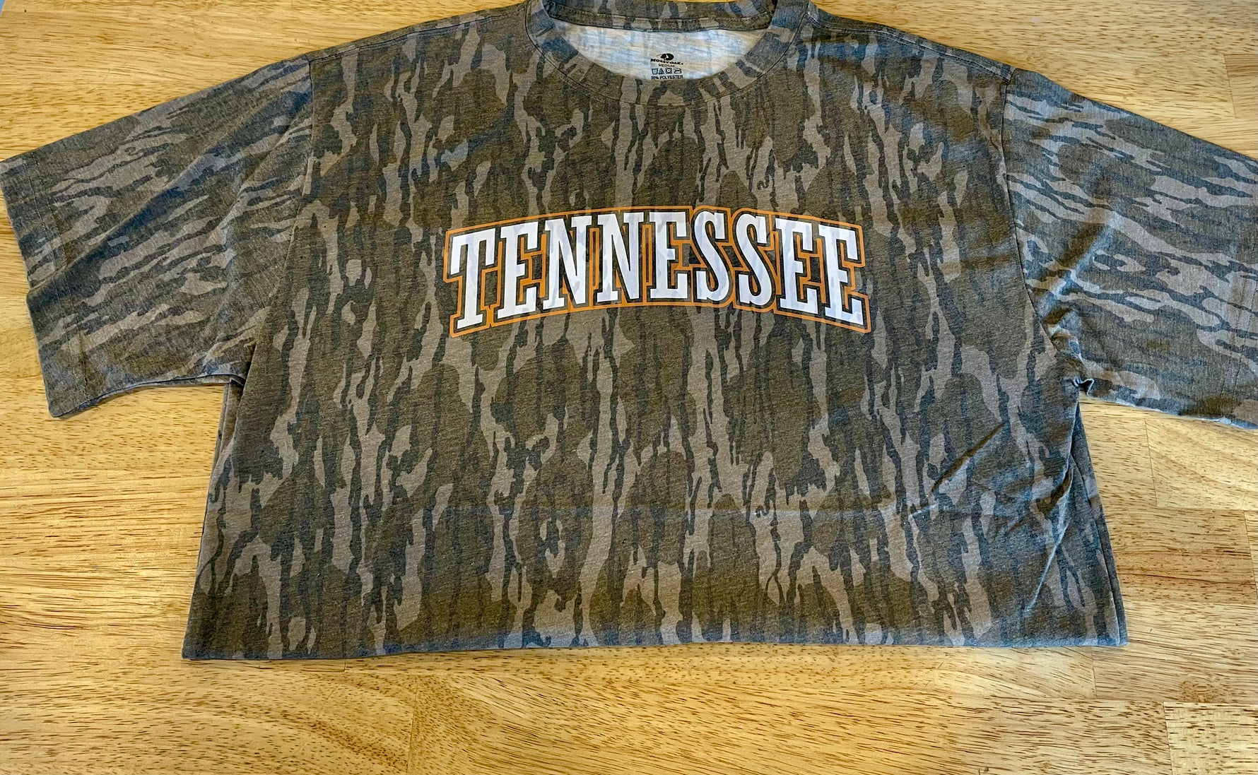 Varsity Letters outlined in Orange on a camo Bottomland T shirt