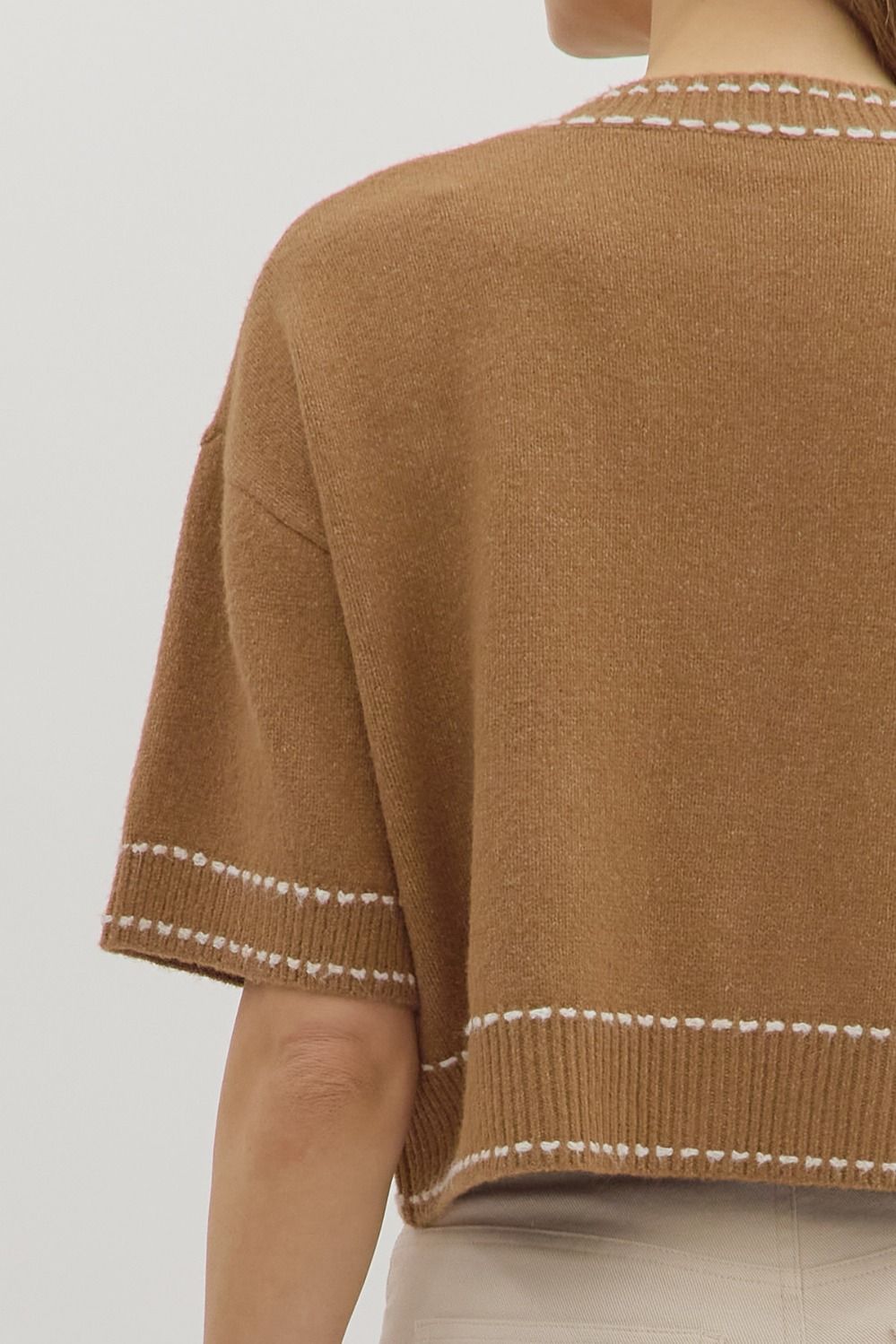 Solid elbow-length sleeve cardigan top featuring contrast accent stitch detail. Button front closure. Faux pockets. Unlined. Knit. Non-sheer. Lightweight.
