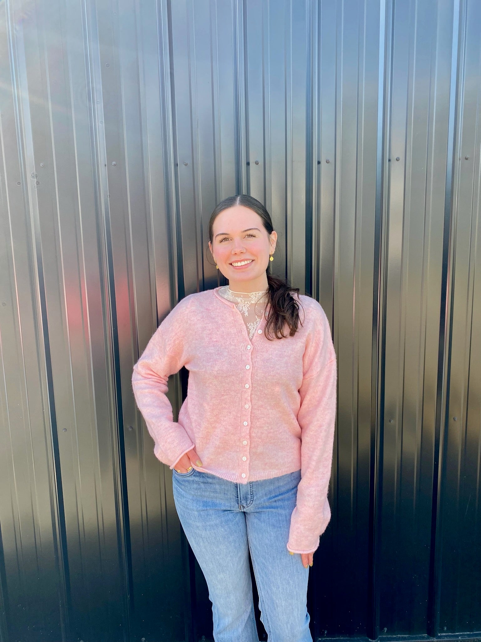 The perfect blend of classic and contemporary, this staple cardigan top features a rolled collar, button-down front, and long sleeves with dropped shoulders. Has a regular length, ribbed hem detail, and a lightweight, relaxed fit makes it versatile enough to wear on its own or as outerwear year-round. You'll want this in every color!