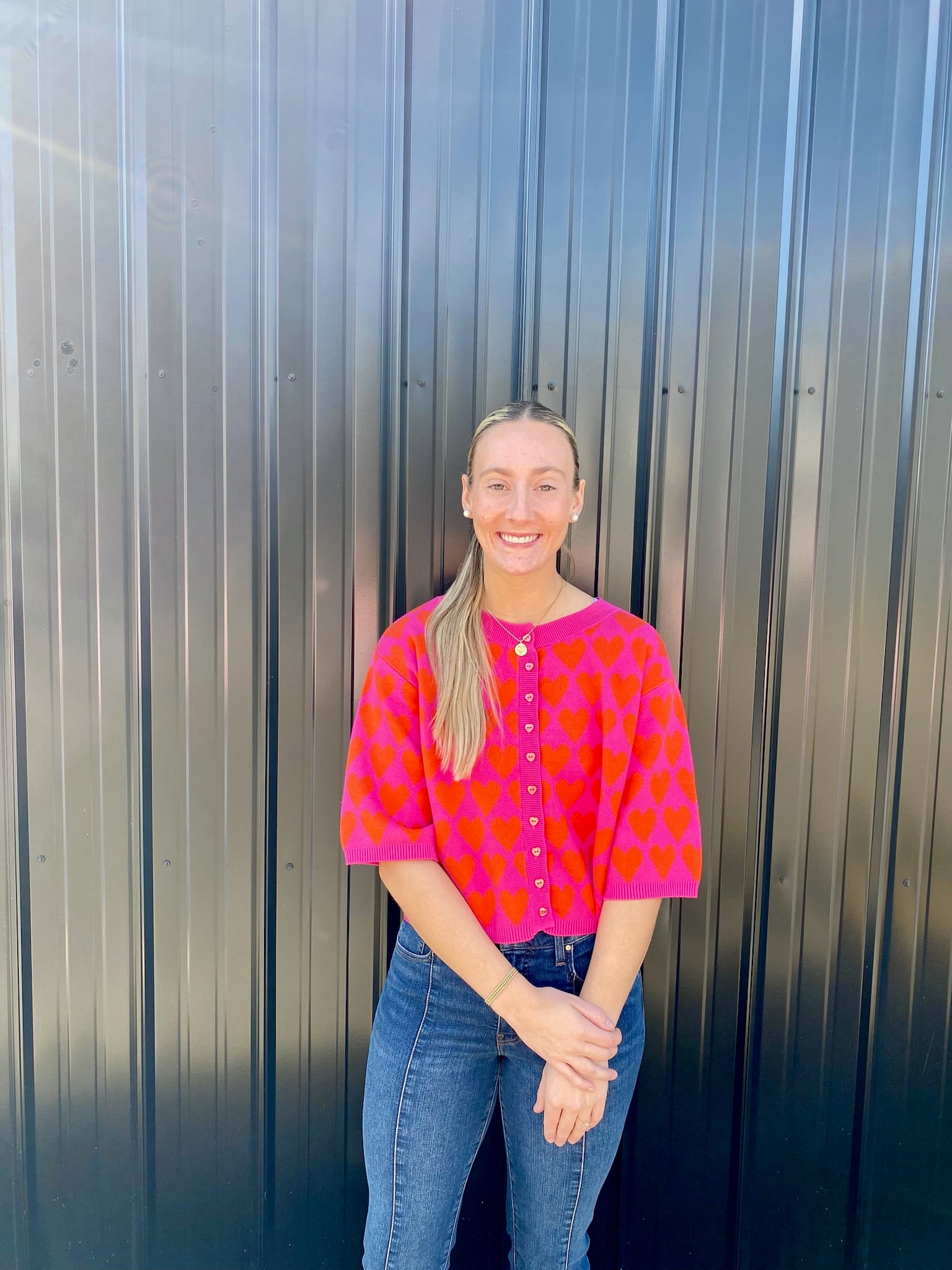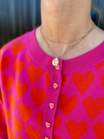 Heart printed sweater with front buttons. Hits just below the elbow.
