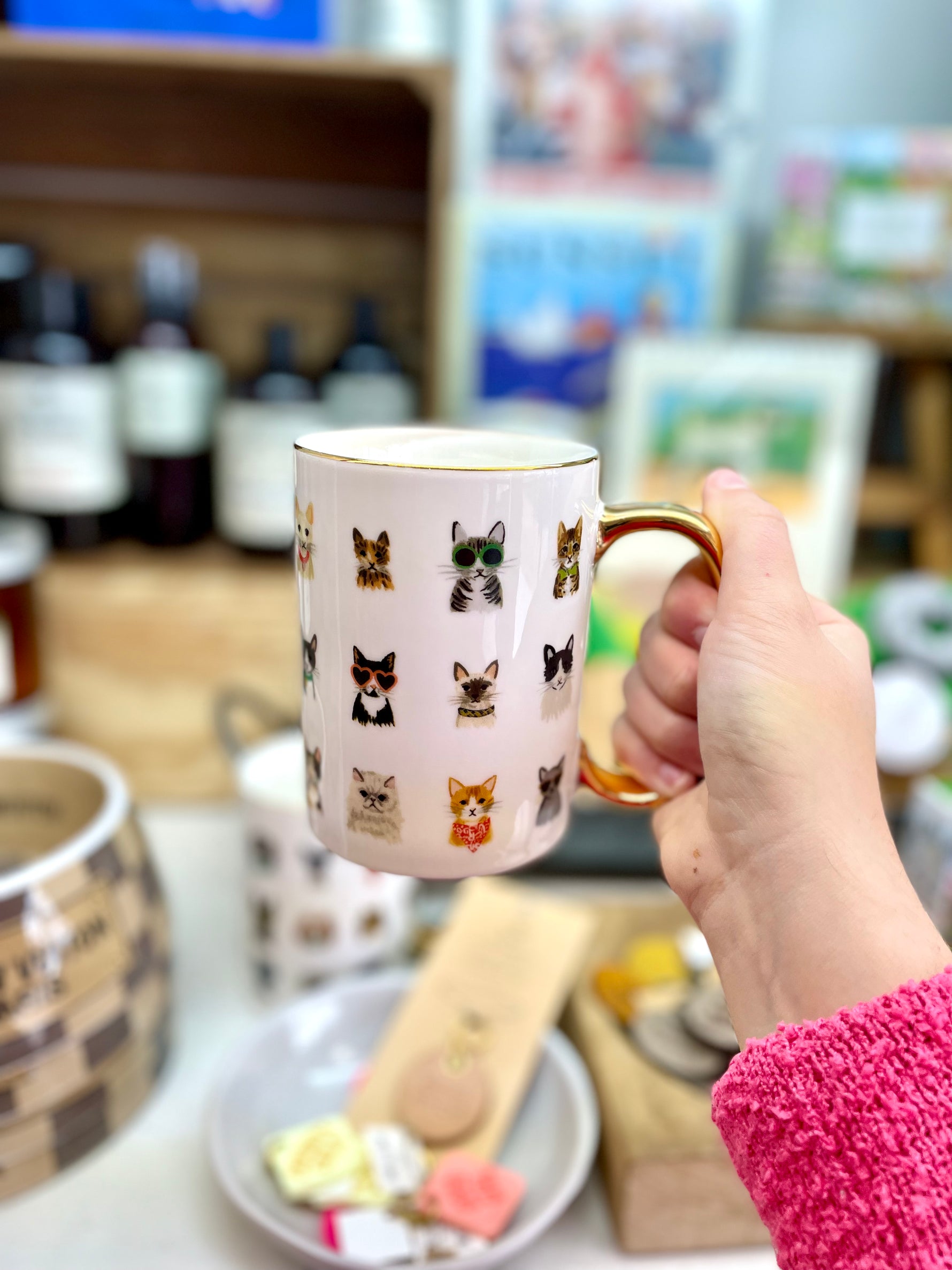 Feline friends rocking their favorite accessories. Celebrate your favorite cat every morning with our Cool Cats mug. Our porcelain mugs feature illustrated designs and a gilded rim and handle to add a little something special to your favorite beverage.