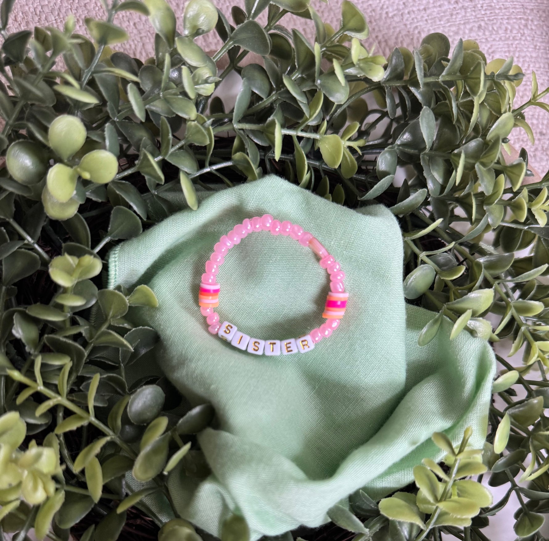 Stretchy bracelet for little girls, baby - toddler with iridescent beads, "sister" beads, and a heart bead.