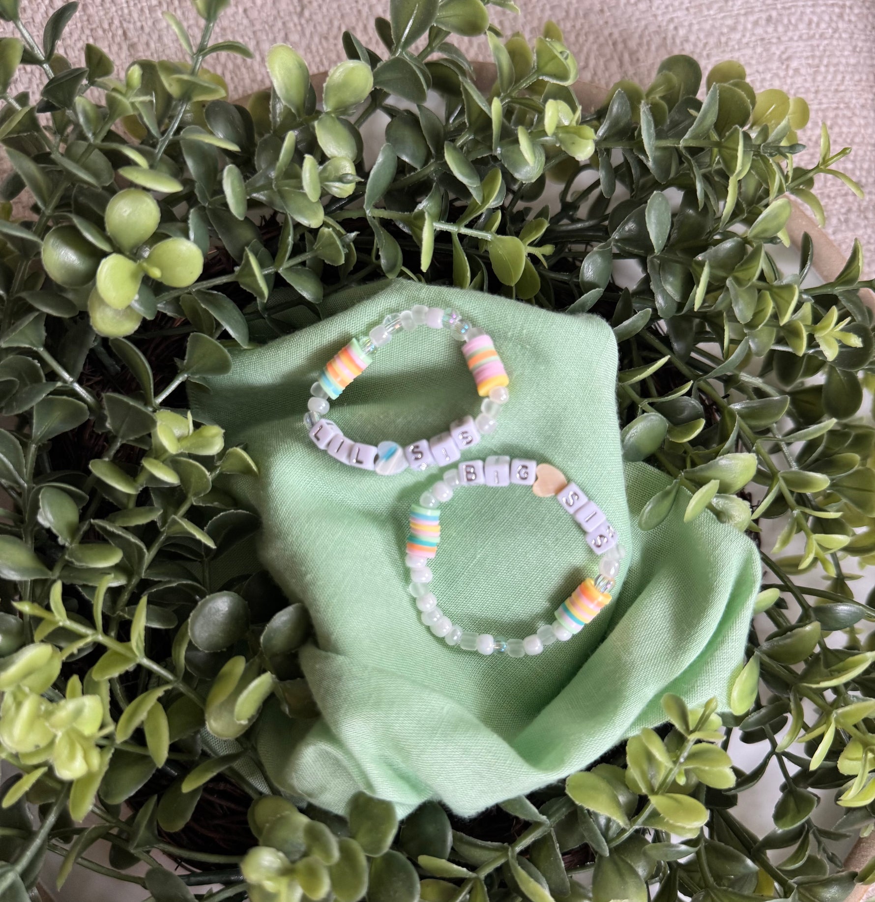 Stretchy bracelet for little girls, baby - toddler with clay and iridescent beads, "big sis" or "lil sis" beads, and a heart bead.