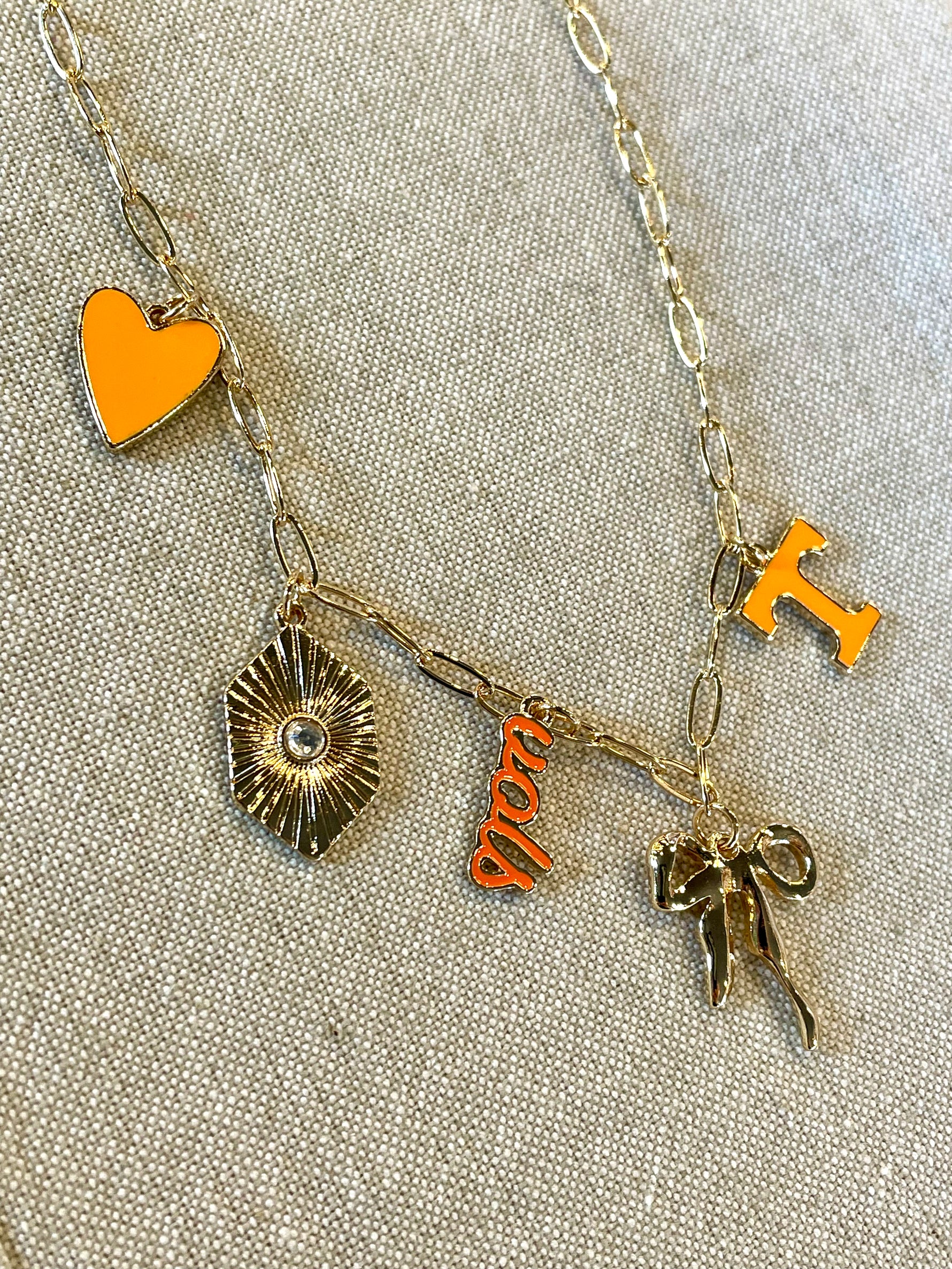 The Tennessee Vols Paper Clip Charm Collector Necklace in Shiny Gold is a customizable way to showcase your Vols pride. Featuring a paper clip chain and multiple Vols-themed charms, this necklace is both stylish and unique.
